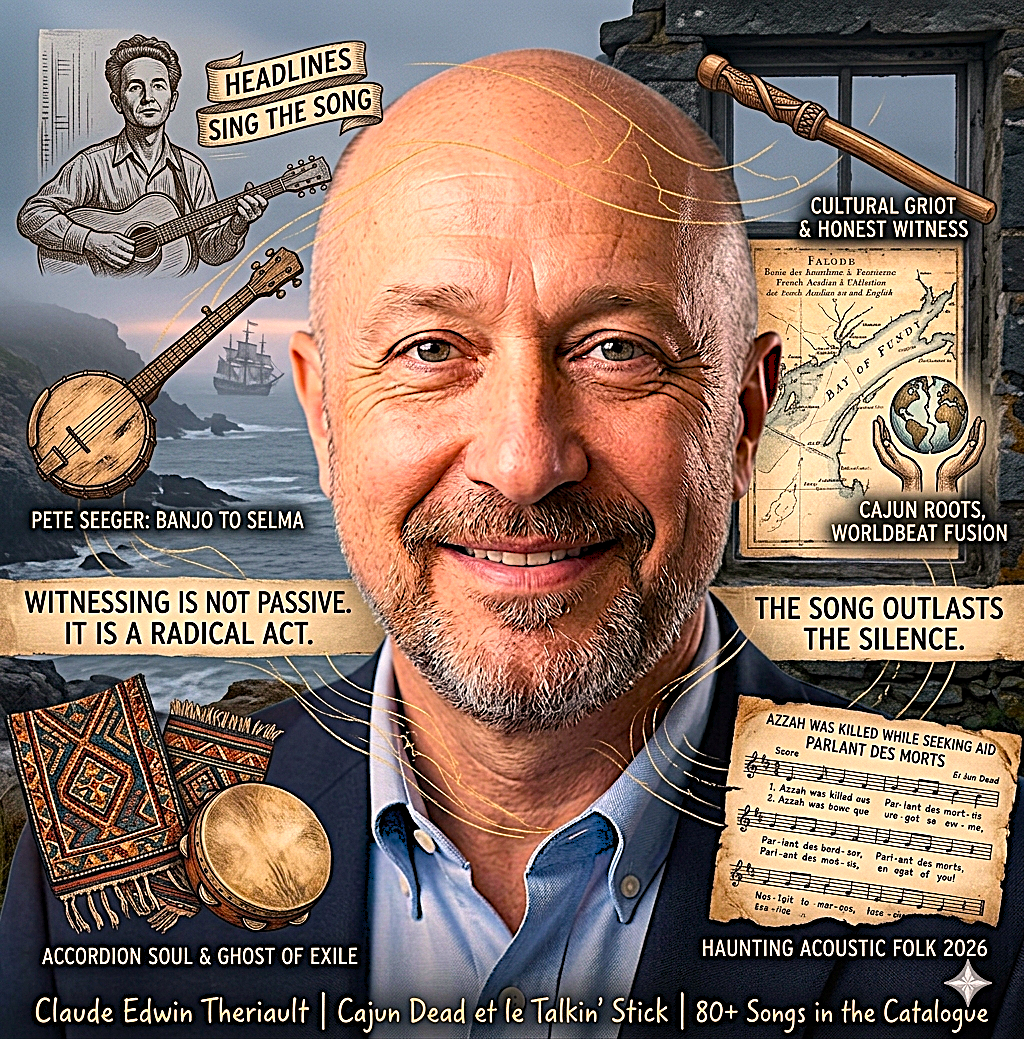 Cajun Dead et le Talkin’ Stick revives folk as moral witness—Claude Edwin Theriault’s Acadian griot songs confront today’s humanitarian crises.