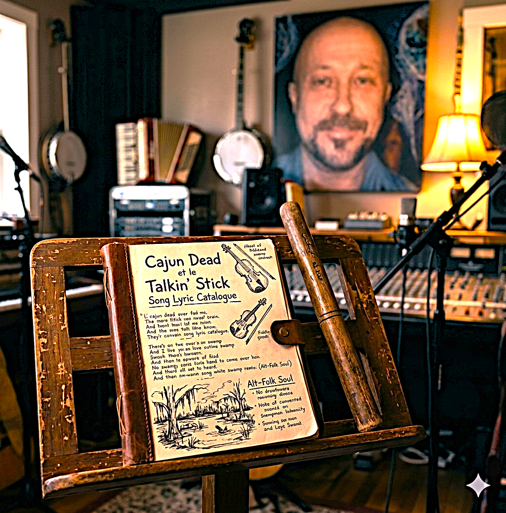 Claude Edwin Theriault is a lyricist — a writer of songs in the most complete and serious sense of that craft, who has been writing lyrics since the 1980s and has accumulated more than one hundred songs carrying specific testimony from a specific life in a specific cultural location. Not a singer. Not a musician. Not a performer seeking a platform. A lyricist in the tradition of the great separated craftspeople — the Tin Pan Alley writers, the Brill Building professionals, the complainte poets of the Acadian oral tradition — whose work exists entirely in the words and whose relationship to the music is one of authorship rather than performance. The Cajun Dead et le Talkin' Stick archive, documented in the complete griot song catalogue, is what four decades of lyric-writing looks like when taken seriously as a creative practice rather than as a component of a performer's personal brand.